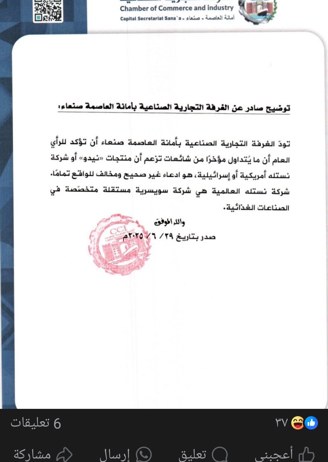 أصدرت الغرفة التجارية الصناعية بأمانة العاصمة صنعاء بيانًا رسميًا كشفت فيه ملابسات الادعاءات المتداولة مؤخرًا حول ارتباط شركة «نستله» ومنتجها الشهير «نيدو» بجهات أمريكية أو إسرائيلية، نافية بشكل قاطع صحة تلك المزاعم.