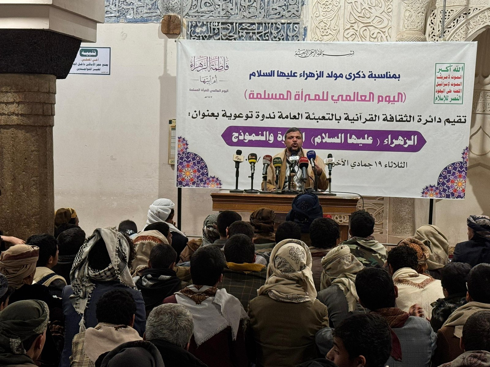 نظّمت دائرة الثقافة القرآنية بالتعبئة العامة، مساء اليوم، ندوة توعوية في الجامع الكبير بصنعاء بمناسبة ذكرى مولد السيدة فاطمة الزهراء عليها السلام، التي تتزامن مع اليوم العالمي للمرأة المسلمة، وذلك تحت عنوان: