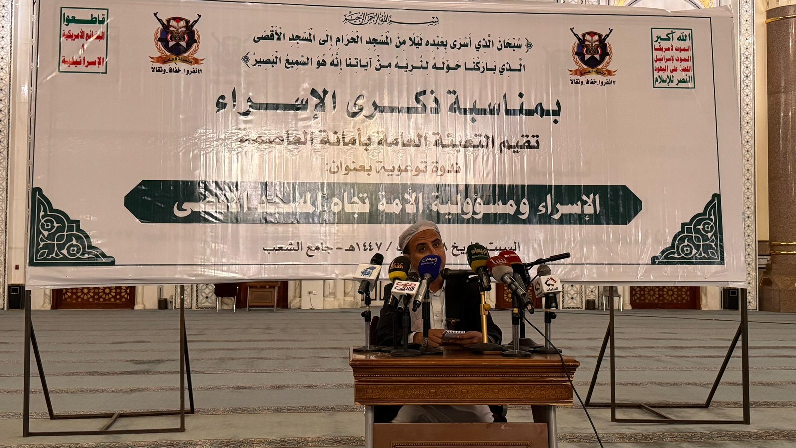 من جانبه، أكّد أمين عام رابطة علماء اليمن العلامة طه الحاضري، أن إحياء ذكرى الإسراء يأتي متزامنًا مع الذكرى السنوية لشهيد القرآن السيد حسين بدر الدين الحوثي، في دلالات تعبّر عن حتمية زوال الكيان الصهيوني وخسارة من يواليه، وبشائر الغلبة والنصر والتمكين لعباد الله المؤمنين.