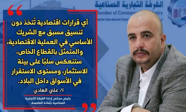 أكد رئيس الغرفة التجارية الصناعية بأمانة العاصمة صنعاء، علي محمد الهادي، أن إدارة الملف الاقتصادي تتركز حالياً بيد الحكومة بنسبة 100%، مشيراً إلى غياب أي شراكة حقيقية مع القطاع الخاص في صناعة القرار الاقتصادي، وهو ما ينعكس سلباً على المستثمرين وعلى الاقتصاد الوطني بشكل عام.