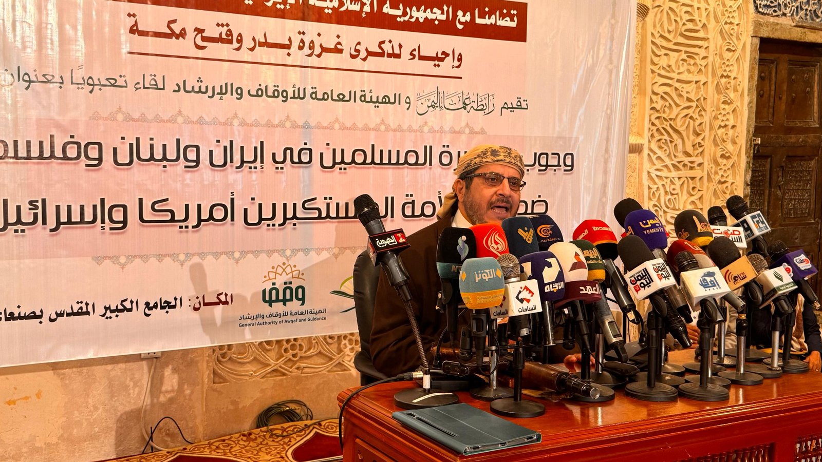 من جانبه أشار رئيس الهيئة العامة للأوقاف والإرشاد العلامة عبدالمجيد الحوثي إلى أن العالم الإسلامي يمر بمرحلة خطيرة تتطلب الوعي والبصيرة ومعرفة العدو ومخططاته، مستذكرًا قيام الثورة الإسلامية في إيران عام 1979 بقيادة الإمام الخميني، وكيف مثلت نقطة تحول في مواجهة الهيمنة الأمريكية والصهيونية، مؤكدًا أن إيران تخوض اليوم معركة الإسلام والمسلمين في مواجهة قوى الاستكبار.