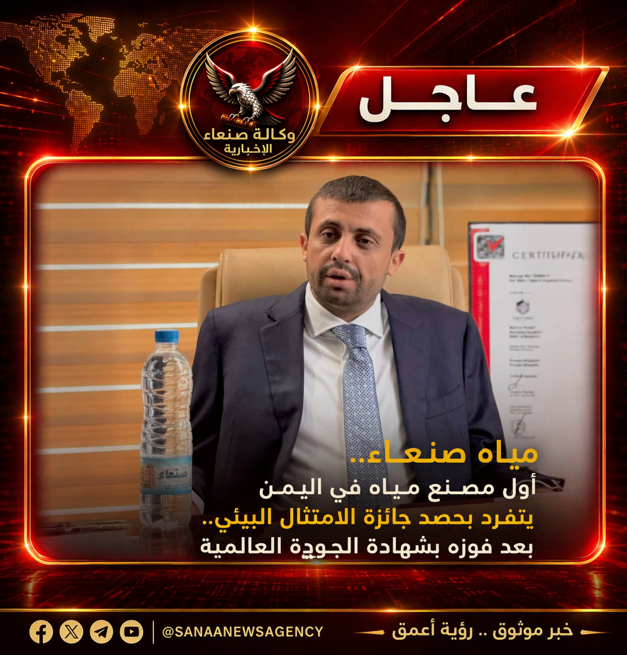 حقق مصنع مياه صنعاء إنجازاً لافتاً بتتويجه بجائزة الامتثال البيئي كأول مصنع مياه في اليمن، وذلك عقب حصوله على شهادة الجودة العالمية، في خطوة تعكس التزامه الراسخ بتطبيق أعلى المعايير الدولية في الإنتاج.