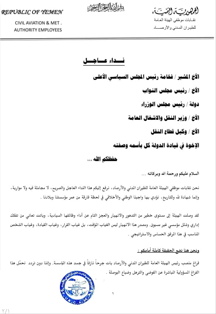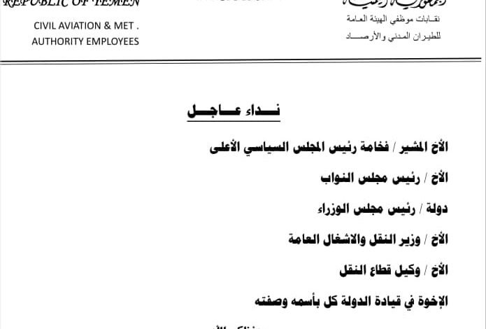 وجهت نقابات موظفي الهيئة العامة للطيران المدني والأرصاد نداءً عاجلًا إلى قيادة الدولة، محذّرة من خطورة استمرار حالة الفراغ القيادي والتعطيل الإداري في الهيئة، الأمر الذي يهدد مباشرة سيادة الأجواء اليمنية.