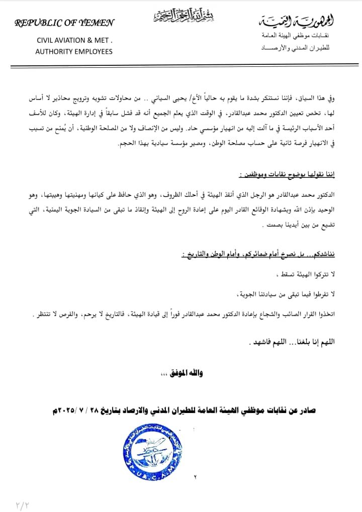 وشددت النقابات في بيانها على أن عودة الدكتور محمد عبد القادر إلى قيادة الهيئة لم تعد مسألة إدارية، بل تحوّلت إلى ضرورة وطنية وأمنية، كونه يتمتع بكفاءة عالية، وخبرة طويلة، وعلاقات إقليمية ودولية متينة تعزز من حماية سيادة اليمن الجوية وتنظيمها.